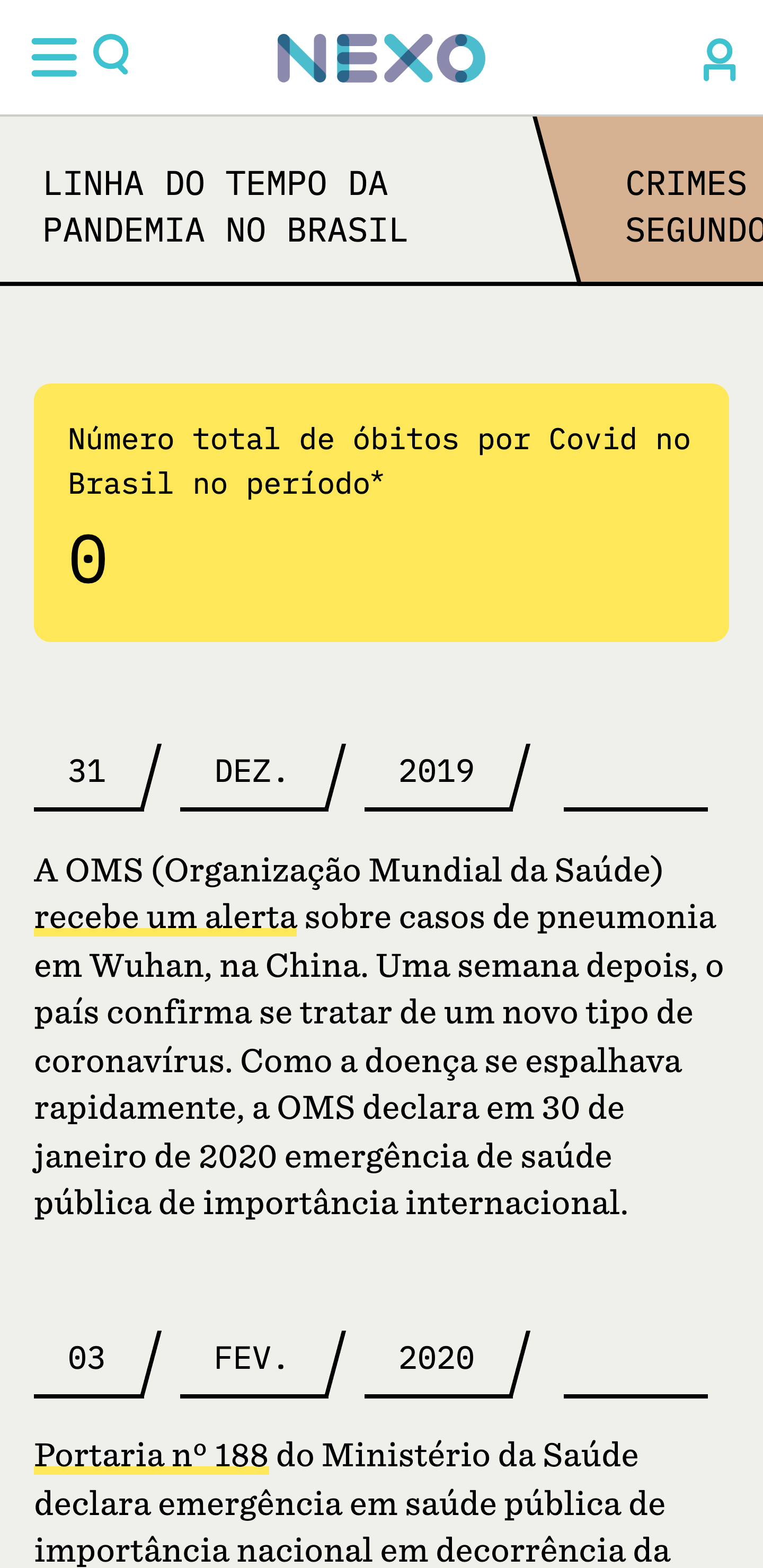A seção 'Linha do tempo da pandemia no Brasil' é longa e detalhada — passa por todos os dias chaves desde o início da pandemia e seus acontecimentos. Seu foco é ser um material de referência, mais do que uma leitura fluída.